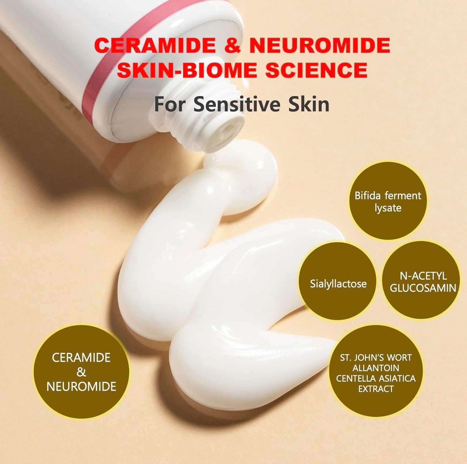 Water, Glycerin, Pentylene glycol, Caprylic/Capric triglyceride, Cetearyl alcohol, Squalane, Polyglyceryl-10 distearate, Sorbitan stearate, Stearic acid, Ceramide NP, N-Palmitoyl serinol (Neuromide), Sodium hyaluronate, Sialyllactose, Centella asiatica extract, Phytosterols, Allantoin, Acetyl glucosamine, Resveratrol, Bifida ferment lysate, Hypericum perforatum flower extract (St.John's wort), Vitis vinifera (Grape) seed oil, Helianthus annuus (Sunflower) seed oil, Tagetes minuta flower oil, Mentha arvensis leaf oil, Mentha viridis (Spearmint) leaf oil, Arginine, Carbomer, Glyceryl stearate, Menthol