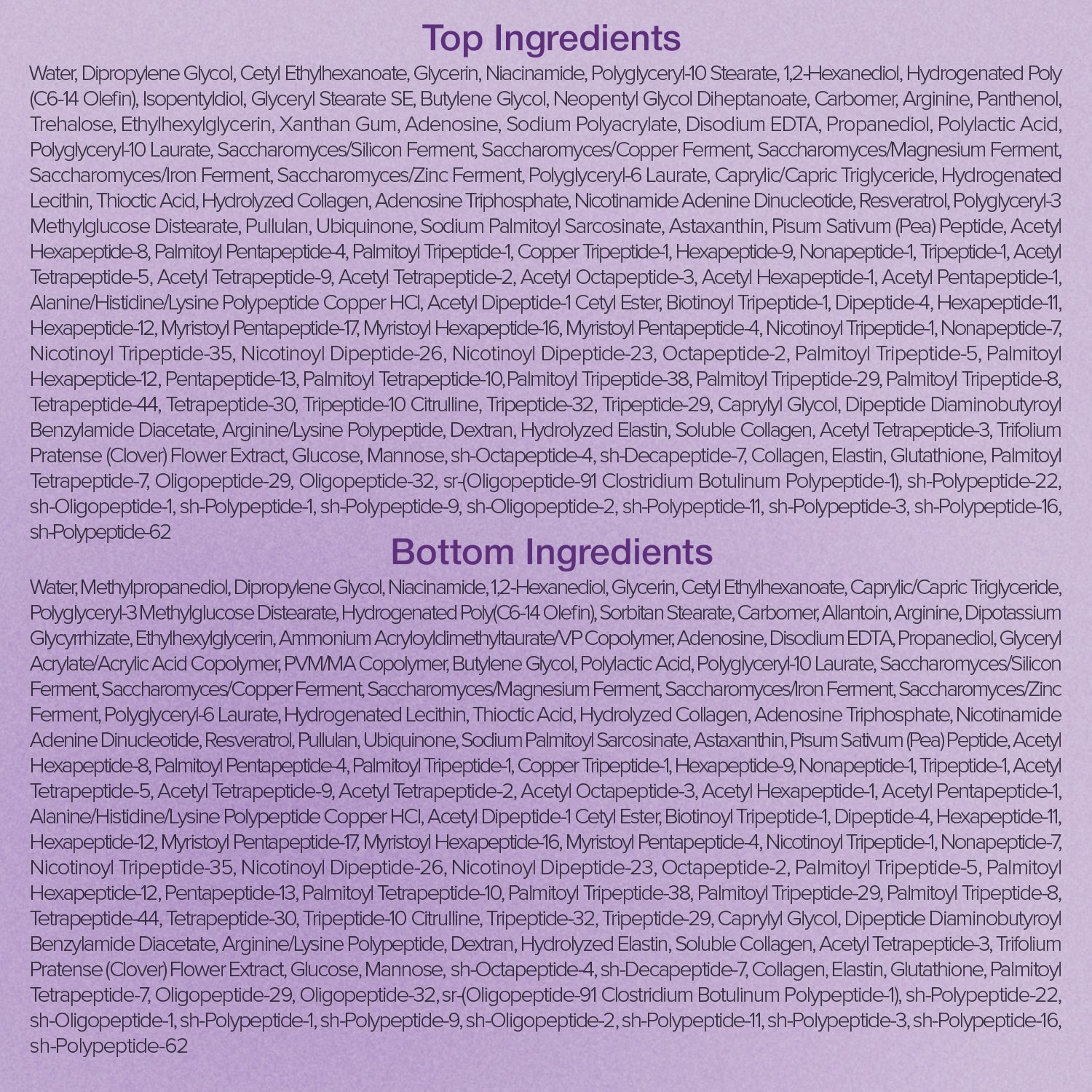 [KEY INGREDIENTS] Formulated with NAD+, an anti-aging ingredient that boosts cell turnover, stimulates collagen production, and supports skin repair, along with 50 types of peptides to plump and firm the skin. Hydrolyzed collagen and adenosine are also added to effectively target wrinkles and enhance skin elasticity.